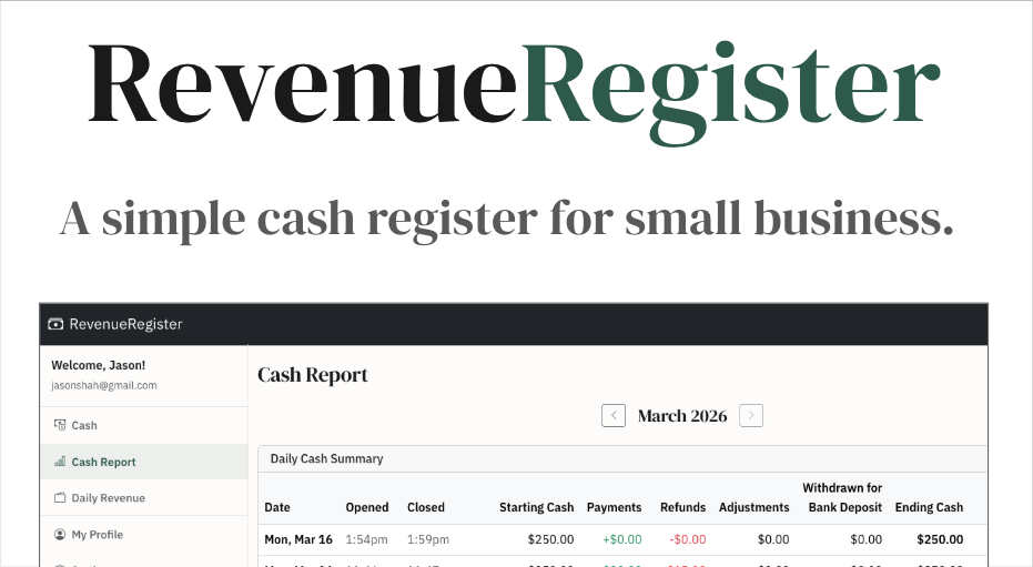 RevenueRegister.com is a cash management tool for service businesses — dental offices, auto shops, salons, and anyone else who handles cash, cards, and checks without needing a full POS system.